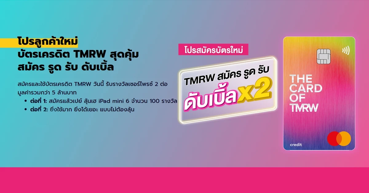 โปรลูกค้าใหม่ บัตรเครดิต TMRW สุดคุ้ม สมัคร รูด รับ ดับเบิ้ล สมัครและใช้บัตรเครดิต TMRW วันนี้ รับรางวัลเซอร์ไพรซ์ 2 ต่อ มูลค่ารวมกว่า 5 ล้านบาท