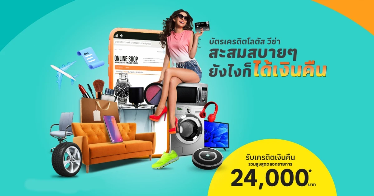 บัตรเครดิตโลตัส วีซ่า สะสมสบายๆ ยังไงก็ได้เงินคืน จะช้อปที่ร้าน หรือช้อปผ่านช่องทางออนไลน์ของร้านค้า* ก็สะสมรวมได้เครดิตเงินคืนทั้ง 5 หมวดที่ร่วมรายการ