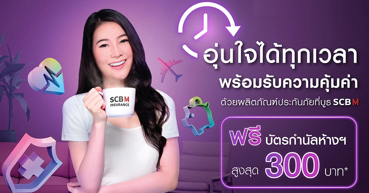 SCB M Insurance อุ่นใจได้ทุกเวลา พร้อมรับความคุ้มค่า ด้วยประกันภัยที่บูธ SCB M ซื้อประกันที่บูธ SCB M วันนี้ รับบัตรกำนัลห้างฯ ในเครือเดอะมอลล์ กรุ๊ป สูงสุด 300 บาท และสิทธิ์ผ่อนชำระค่าเบี้ยฯ 0% สูงสุด 12 เดือน