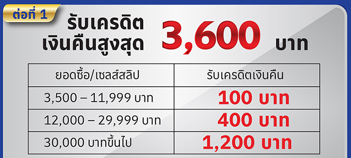 - รับเครดิตเงินคืนสูงสุด 3,600 บาท เมื่อใช้จ่ายตามที่กำหนด