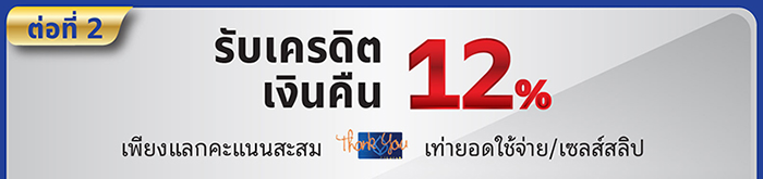 - รับเพิ่มเครดิตเงินคืนสูงสุด 12% เมื่อแลกใช้คะแนนสะสมเท่ายอดใช้จ่ายต่อเซลส์สลิป