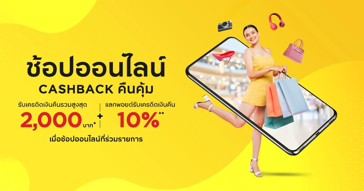 - *สงวนสิทธิ์การให้เครดิตเงินคืนสูงสุด 1,000 บาท/บัญชีบัตรหลัก/เดือน และสูงสุด 2,000 บาท/บัญชีบัตรหลัก/ตลอดรายการ โดยยอดเครดิตเงินคืนจะคำนวณรวมจากแอปพลิเคชัน/ร้านค้าช้อปปิ้งออนไลน์ที่ร่วมรายการ (คำนวณยอดใช้จ่ายจากทั้งบัตรหลักและบัตรเสริมรวมกัน)