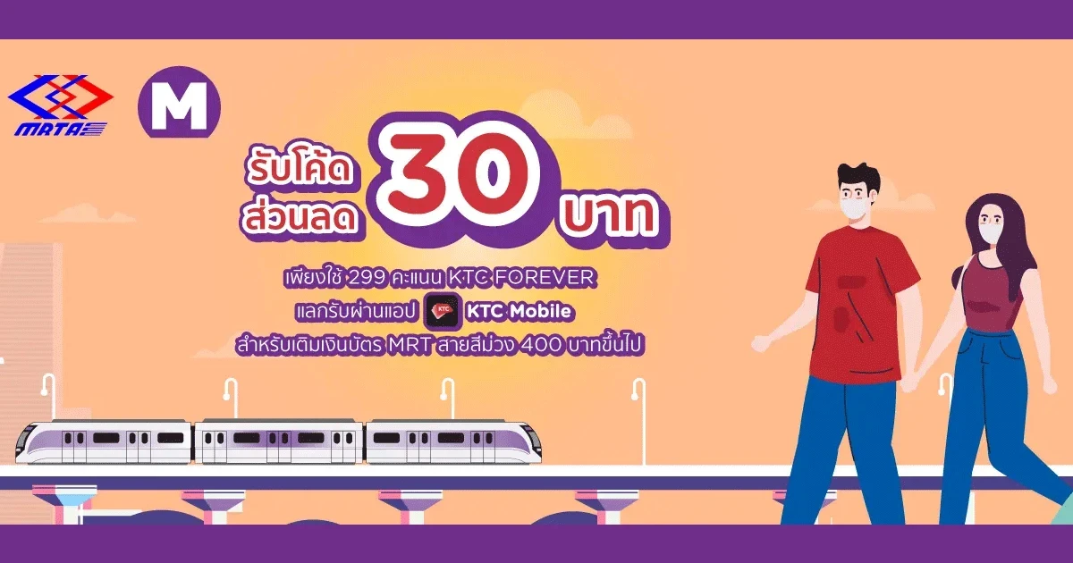 โปรโมชั่น ส่วนลด ที่ MRT สายสีม่วง กับบัตรเครดิต KTC รับโค้ดส่วนลด 30 บาท เพียงใช้ 299 คะแนน KTC FOREVER แลกรับผ่านแอป KTC Mobile สำหรับเติมเงินบัตร MRT สายสีม่วง 400 บาทขึ้นไป