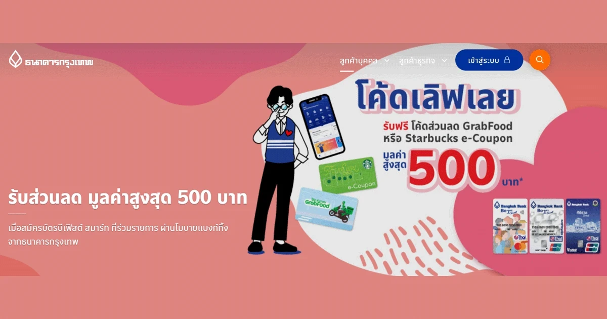 โค้ดเลิฟเลย รับโค้ดส่วนลด GrabFood หรือ Starbucks e-Coupon มูลค่าสูงสุด 500 บาท เมื่อสมัครบัตรบีเฟิสต์ สมาร์ท ที่ร่วมรายการ ผ่านโมบายแบงก์กิ้งจากธนาคารกรุงเทพ