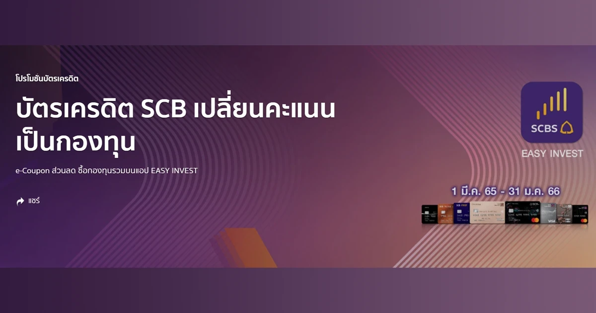 - สิทธิพิเศษสำหรับผู้ถือบัตรเครดิตไทยพาณิชย์ทุกประเภท ยกเว้นบัตรเครดิต SCB Family Plus, บัตรเครดิต SCB M ทุกประเภท และบัตรเครดิตนิติบุคคล ("ผู้ถือบัตร") สามารถใช้คะแนนสะสม SCB Rewards ตั้งแต่ 10,000 – 120,000 คะแนน เพื่อแลกรับ e-Coupon ผ่านเมนูแลกของรางวัลบนแอปพลิเคชัน SCB EASY ระหว่างวันที่ 1 มีนาคม 2565 – 31 มกราคม 2566 หรือ จนกว่าสินค้าจะหมด เพื่อเป็น e-Couponในการซื้อกองทุนรวม (Mutual Fund) ทุกกองทุน