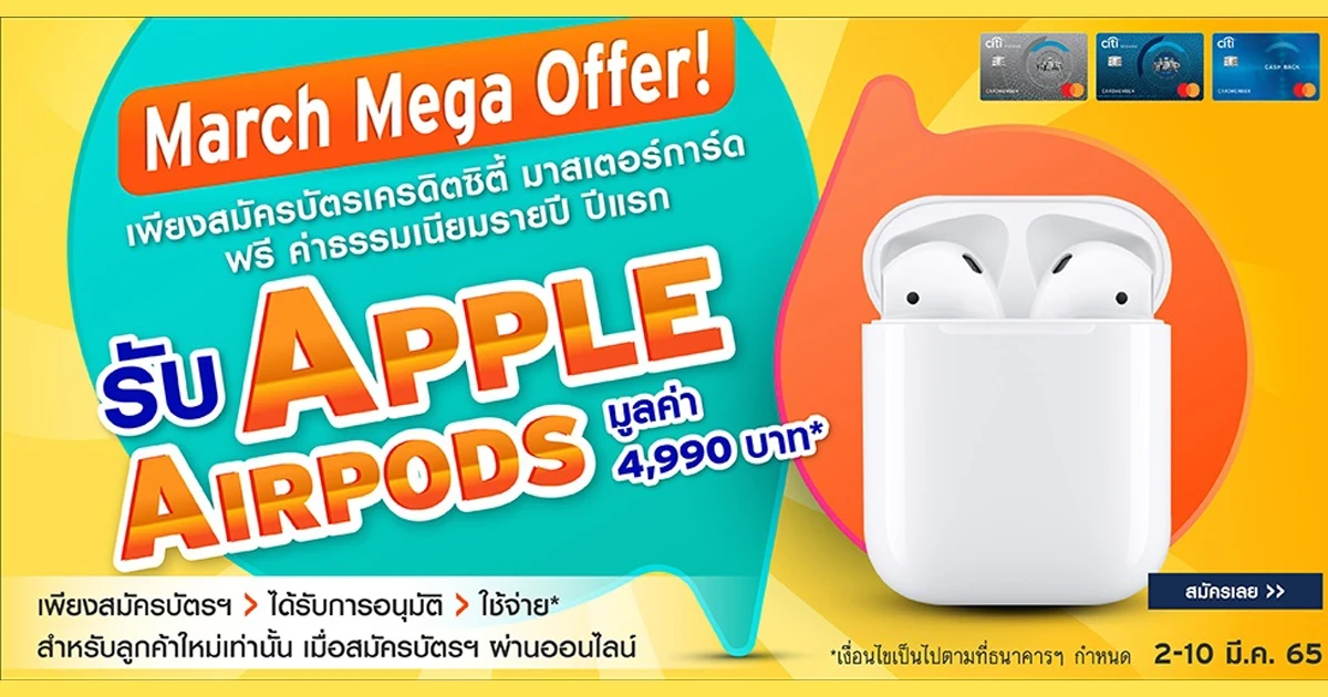 March Mega Offer! สิทธิพิเศษสำหรับลูกค้าใหม่ที่สมัครบัตรเครดิตซิตี้ มาสเตอร์การ์ด ผ่านช่องทางออนไลน์ และได้รับการอนุมัติภายในระยะเวลาที่กำหนด รับเลย Apple Airpods มูลค่า 4,990 บาท*