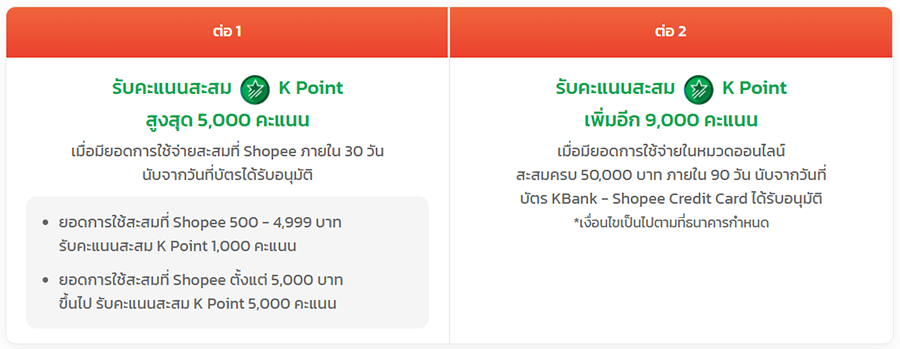 ต่อที่ 2  รับคะแนนสะสม K Point เพิ่ม 9,000 คะแนนเมื่อมียอดการใช้จ่ายออนไลน์สะสมครบ 50,000 บาท ภายใน 90 วัน นับจากวันที่บัตร KBank - Shopee Credit Card ได้รับอนุมัติ