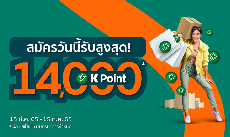 3. จำกัดสิทธิ์การรับคะแนนสะสม K Point 1 สิทธิ์/ท่าน (สูงสุดไม่เกิน 14,000 คะแนน/ท่าน) ตลอดระยะเวลาส่งเสริมการขาย