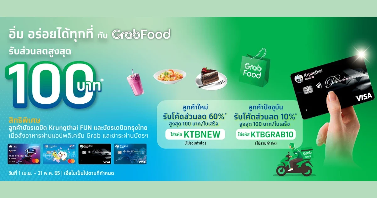 - รายการส่งเสริมการขายนี้ ธนาคารกรุงไทย จำกัด (มหาชน) ("ธนาคาร") จัดทำขึ้น สำหรับลูกค้าธนาคารที่ ชำระค่าสินค้าผ่านบัตรเดบิต Krungthai FUN หรือบัตรเดบิตกรุงไทย ทุกประเภท ("ลูกค้า") เมื่อสั่งอาหารผ่านแอปพลิเคชัน Grab ในระหว่างวันที่ 1 เมษายน 2565 –31 พฤษภาคม 2565 หรือจนกว่าจะครบตามจำนวนสิทธิ์ที่กำหนด สิทธิประโยชน์ดังกล่าวสงวนสิทธิ์เฉพาะลูกค้าที่มีบัญชีธนาคาร และชำระด้วยบัตรเดบิต Krungthai FUN หรือบัตรเดบิตธนาคารกรุงไทย เท่านั้น