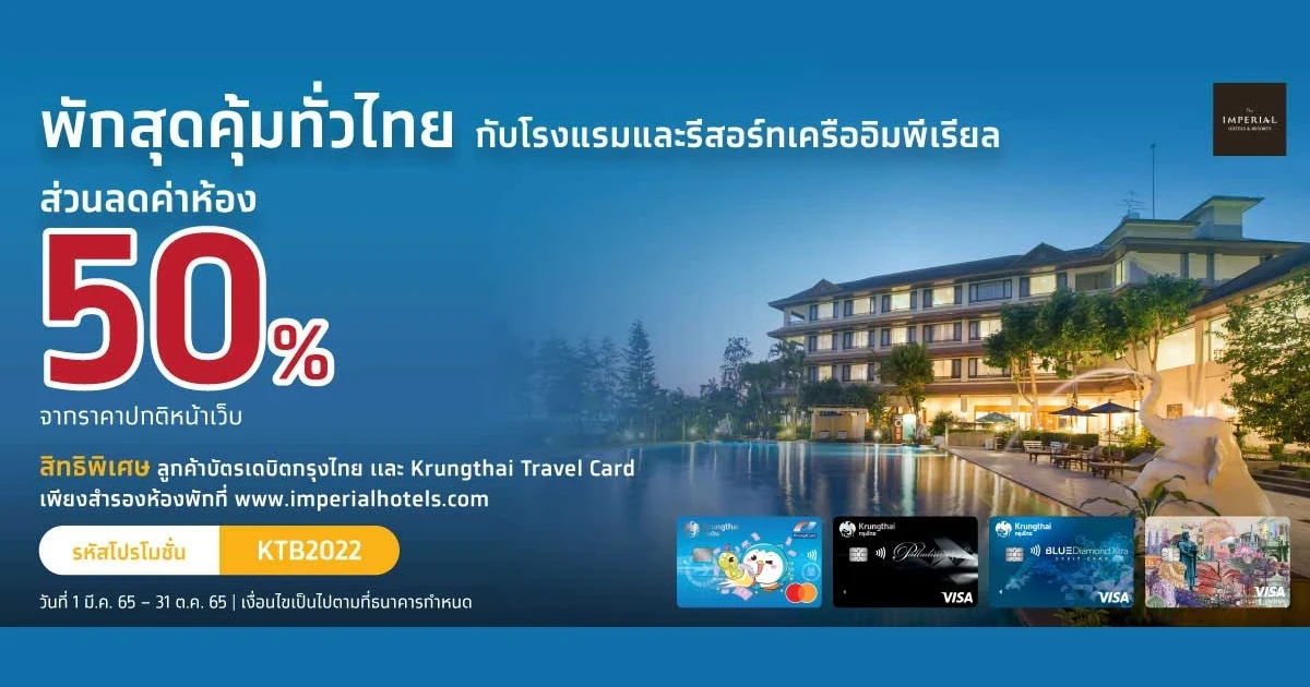 พักสุดคุ้มทั่วไทย กับโรงแรมและรีสอร์ทเครืออิมพีเรียล สิทธิพิเศษ ลูกค้าบัตรเดบิตกรุงไทย และ Krungthai Travel Card รับส่วนลดค่าห้อง 50% จากราคาปกติหน้าเว็บ เพียงสำรองห้องพักที่ www.imperialhotels.com