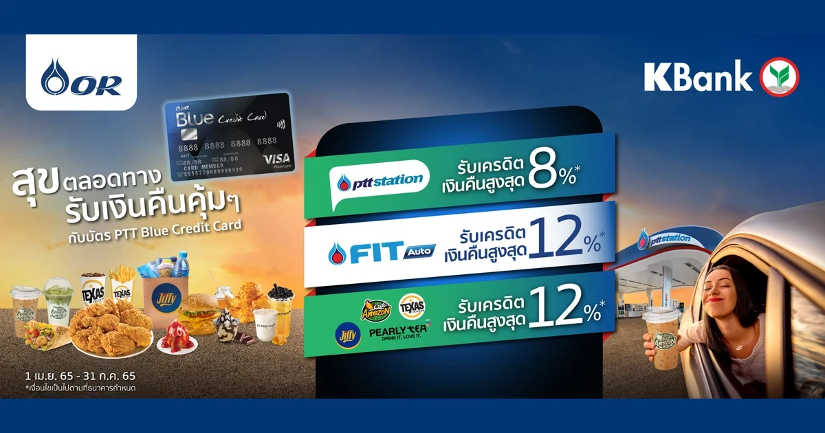 - เฉพาะยอดใช้จ่ายผ่านบัตร PTT Blue Credit Card ที่ร้านค้าในเครือโออาร์ที่ร่วมรายการ ระหว่างวันที่ 1 เม.ย. 65 - 31 ก.ค. 65 เท่านั้น