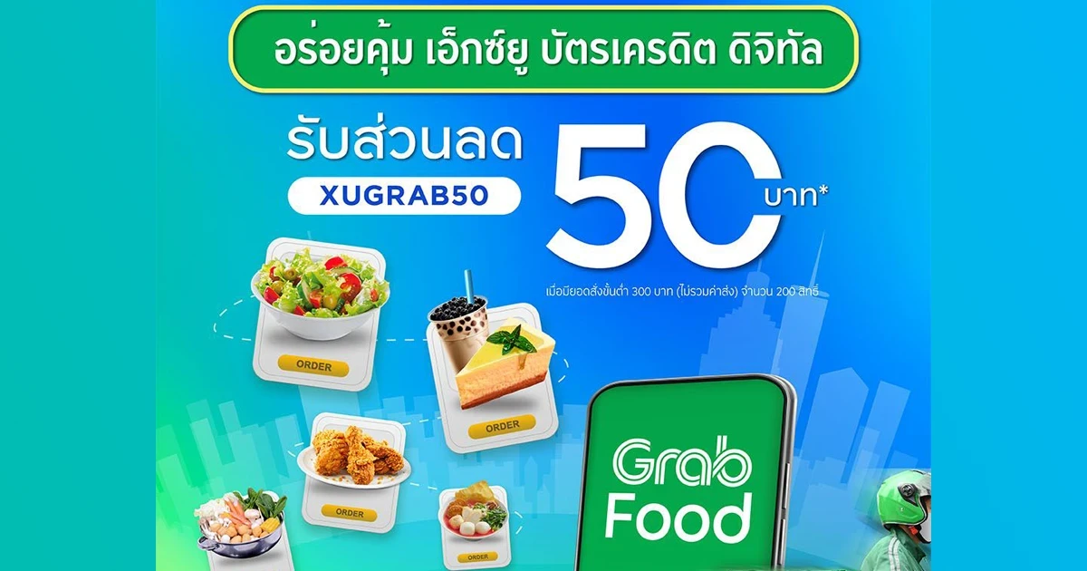 รับโค้ดส่วนลดแกร็บฟู้ด มูลค่า 50 บาท* เพียงสั่งอาหารผ่านแอปพลิเคชัน Grab ด้วยเอ็กซ์ยู บัตรเครดิต ดิจิทัล สั่งอาหารเดลิเวอรี่จานโปรด จากร้านอาหารเด็ดส่งตรงถึงมือคุณ รับส่วนลดค่าอาหาร มูลค่า 50 บาท* เมื่อมียอดสั่งอาหารบน GrabFood ตามเงื่อนไข
