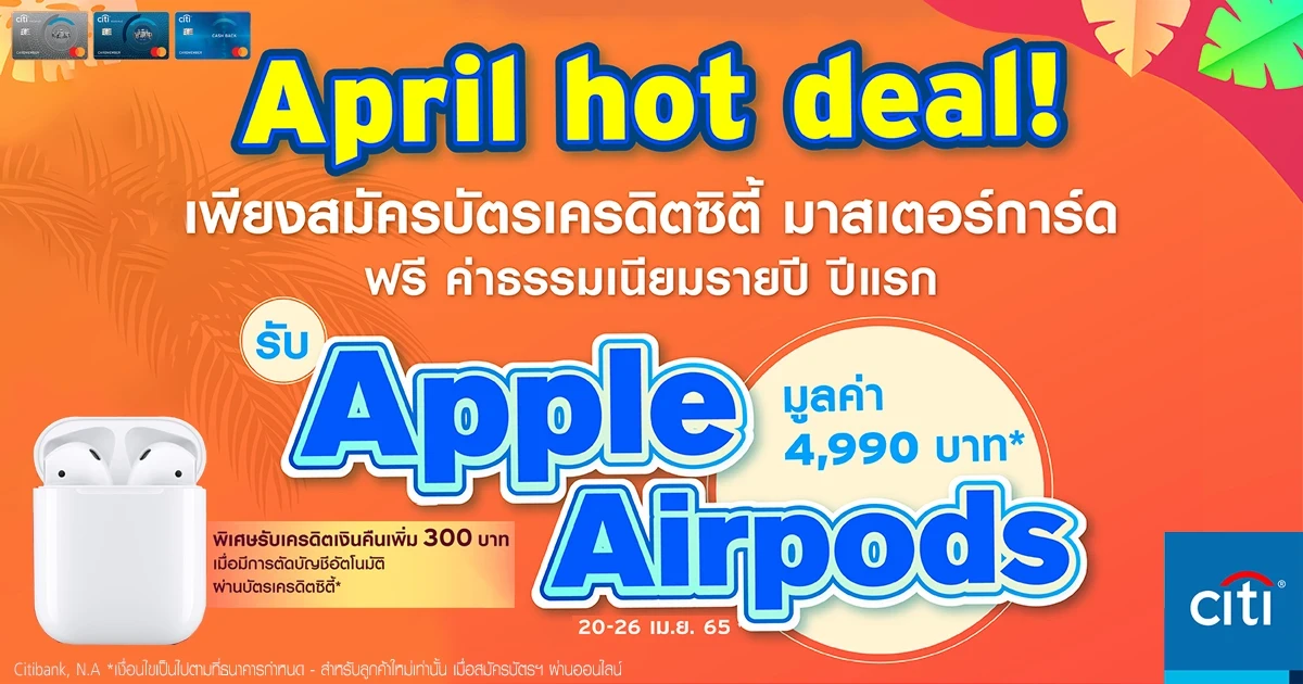 April hot deal! สมัครเลย รับ Apple Airpods มูลค่า 4,990 บาท* เพียงสมัครบัตรฯ > ได้รับการอนุมัติ > ใช้จ่าย* ฟรี ค่าธรรมเนียมรายปี ปีแรก