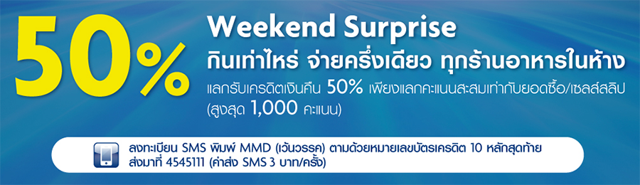 50% Weekend Surprise ทานเท่าไหร่ แลกรับเครดิตเงินคืน 50% (เฉพาะวันศุกร์-อาทิตย์) เมื่อใช้จ่ายผ่านบัตรเครดิตยูโอบีที่ร้านอาหารภายในศูนย์การค้าและห้างสรรพสินค้าเซ็นทรัล เอ็มบาสซี และเซ็นทรัล ชิดลม และแลกคะแนนสะสม UOB Reward Plus เท่ากับยอดใช้จ่าย/เซลส์สลิป