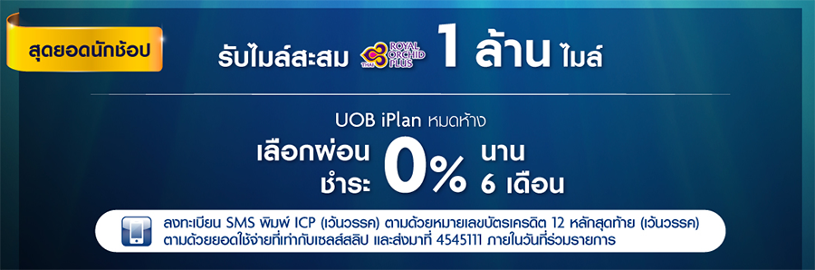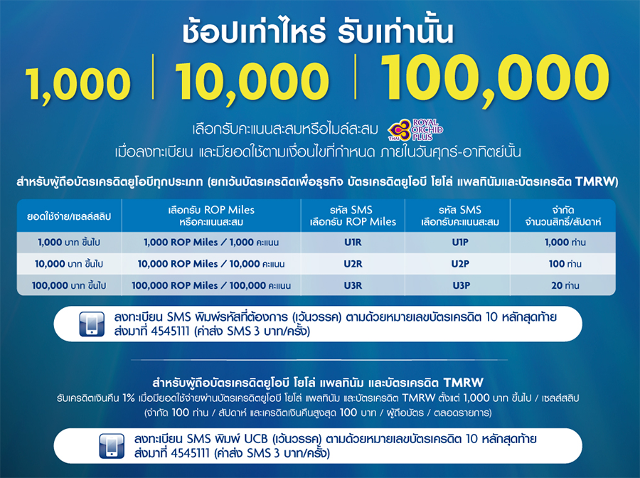 สำหรับผู้ถือบัตรเครดิตยูโอบีทุกประเภท (ยกเว้นบัตรเครดิตเพื่อธุรกิจ บัตรเครดิตยูโอบี โยโล่ แพลทินัม และบัตรเครดิต TMRW) รับไมล์สะสม รอยัล ออร์คิด พลัส (ROP Miles) หรือคะแนนสะสม UOB Rewards Plus สูงสุด 100,000 คะแนน / ROP Miles เมื่อมียอดใช้จ่ายต่อเซลส์สลิปผ่านบัตรเครดิตยูโอบี ตามเงื่อนไขที่กำหนด ที่ร้านค้าภายในศูนย์การค้าและห้างสรรพสินค้าเซ็นทรัล เอ็มบาสซี และเซ็นทรัล ชิดลม ทุกวันศุกร์ – อาทิตย์