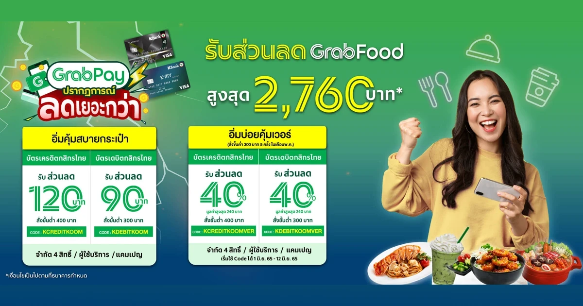 - ติดต่อสอบถามข้อมูลเพิ่มเติมเกี่ยวกับรายการส่งเสริมการขายได้ที่ Grab Help Center และ K-Contact Center โทร. 02-8888888