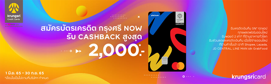 โปรโมชันสมัครบัตรเครดิต กรุงศรี นาว ผ่านช่องทางเว็บไซต์ วันนี้ รับเครดิตเงินคืนสูงสุด 2,000 บาท* เมื่อมียอดใช้จ่ายผ่านบัตรตามเงื่อนไขต่อเนื่องกันครบ 60 วัน