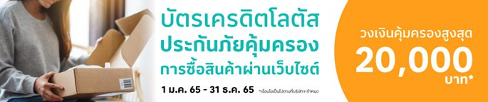 - สงวนสิทธิ์การรับสิทธิประโยชน์ดังกล่าว จากการซื้อสินค้าผ่านบัตรเครดิตโลตัส แพลทินัม บียอนด์ หรือบัตรเครดิตโลตัส แพลทินัม รีวอร์ด รับความคุ้มครองสูงสุด 20,000 บาท ต่อปี เมื่อซื้อสินค้าผ่านช่องทางออนไลน์ และชำระค่าสินค้าผ่านระบบการชำระเงินทางอินเตอร์เน็ต ด้วยบัตรเครดิตโลตัส แพลทินัม บียอนด์ หรือบัตรเครดิตโลตัส แพลทินัม รีวอร์ด ตั้งแต่ 1 ม.ค. 65 - 31 ธ.ค. 65