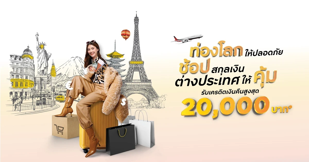 สิทธิพิเศษสำหรับลูกค้าบัตรเครดิต กรุงศรี บัตรเครดิต โฮมโปร วีซ่า แพลทินัม บัตรเครดิต เอไอเอ วีซ่า และบัตรเครดิต สยามทาคาชิมายะ ท่องโลกให้ปลอดภัย ช้อปสกุลต่างประเทศให้คุ้ม รับเครดิตเงินคืนสูงสุด 20,000 บาท*