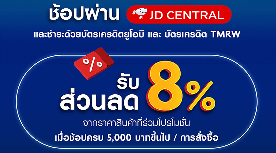 รับส่วนลด 8% เมื่อช้อปผ่าน JD Central และชำระด้วยบัตรเครดิตยูโอบี และบัตรเครดิต TMRW