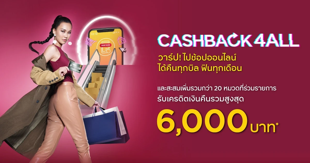คุ้ม 1: ไม่ต้องแลกพอยต์ รับเครดิตเงินคืนเพิ่มรวมสูงสุด 6,000 บาท* จากโปรโมชั่น CASHBACK4ALL เพียงสะสมยอดใช้จ่ายร้านค้าออนไลน์ที่ร่วมรายการ และกว่า 20 หมวดอื่นที่ร่วมรายการ (1 ก.ค. 65 – 30 ก.ย. 65)