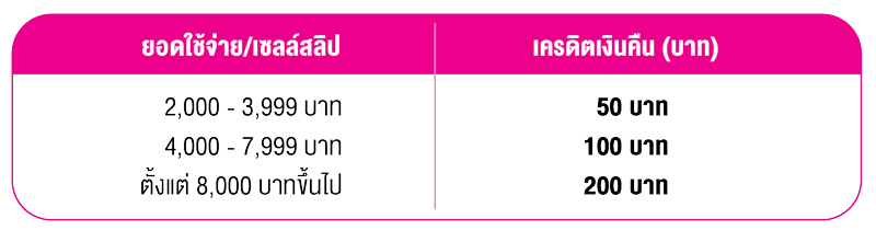 - ธนาคารจะเครดิตเงินคืนโดยคำนวณยอดใช้จ่ายต่อเซลล์สลิป ผู้ถือบัตรไม่สามารถนำใบเสร็จหรือเซลล์สลิปมารวมกันในการรับเครดิตเงินคืนสำหรับรายการส่งเสริมการขายนี้