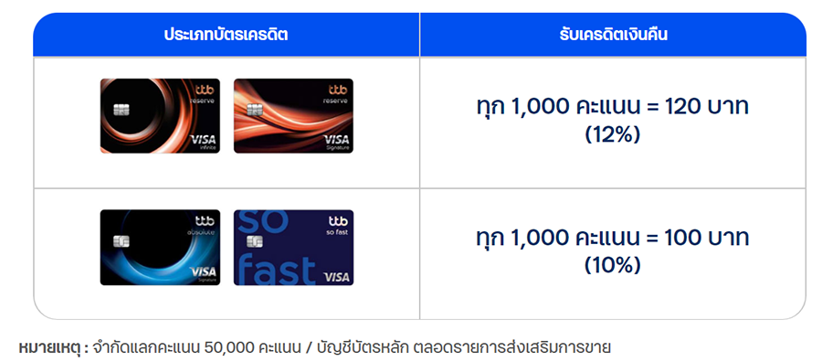 - การแลกคะแนนสะสมรับเครดิตเงินคืนต้องมียอดใช้จ่ายขั้นต่ำ 1,000 บาทขึ้นไป / เซลล์สลิป ผ่าน เว็บไซต์ และ แอปพลิเคชันออนไลน์ ที่ร่วมรายการ ได้แก่ JD Central (JD.co.th), LAZADA Thailand และ Shopee Thailand ตามเงื่อนไขที่กำหนด ระหว่างวันที่ 1 ต.ค. 65 - 31 ธ.ค. 65 เท่านั้น โดยคะแนนสะสมทุก 1,000 คะแนน แลกรับเครดิตเงินคืน 120 บาท สำหรับบัตรเครดิต ttb reserve infinite และบัตรเครดิต ttb reserve signature และ แลกรับเครดิตเงินคืน 100 บาท สำหรับบัตรเครดิต ทีทีบี (บัตรเครดิตทีเอ็มบี และบัตรเครดิตธนชาต) ประเภทที่มีคะแนนสะสม ทั้งนี้การแลกคะแนนสะสมแต่ละครั้งต้องไม่เกินยอดใช้จ่ายต่อเซลล์สลิป โดยระบบจะคำนวณเฉพาะบัตรหลักที่มีการลงทะเบียนเท่านั้น