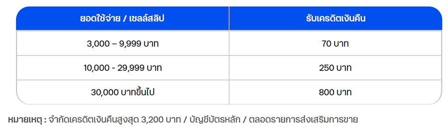 - จำกัดเครดิตเงินคืนสูงสุด 3,200 บาท / บัญชีบัตรหลัก / ตลอดรายการส่งเสริมการขาย สำหรับบัตรเครดิตทุกประเภท