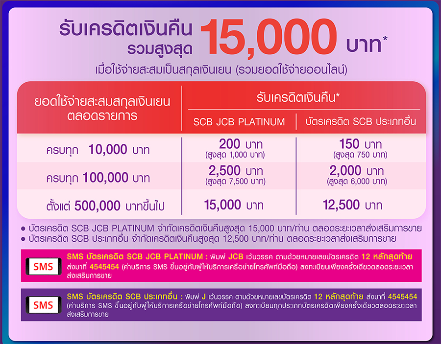 - ผู้ถือบัตร SCB JCB PLATINUM ส่ง SMS เพื่อลงทะเบียนเข้าร่วมรายการส่งเสริมการขายนี้ โดยพิมพ์ JCB เว้นวรรค ตามด้วยหมายเลขบัตรเครดิต 12 หลักสุดท้าย ส่งมาที่ 4545454 (ค่าบริการ SMS ขึ้นอยู่กับผู้ให้บริการเครือข่ายโทรศัพท์มือถือ) ลงทะเบียนเพียงครั้งเดียวตลอดระยะเวลาส่งเสริมการขาย