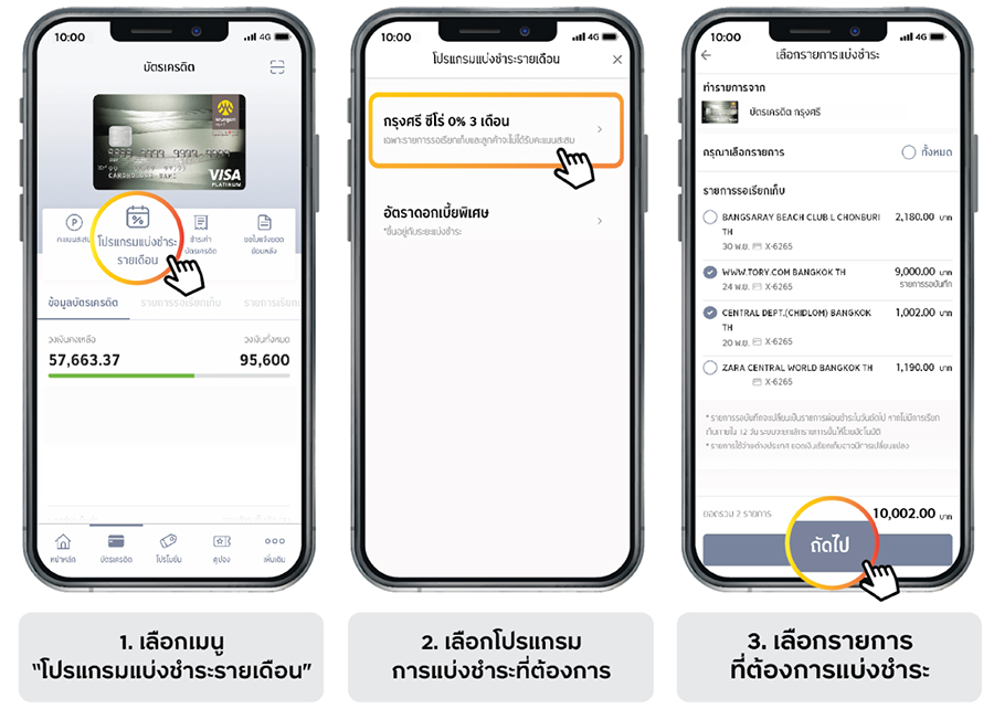 เปลี่ยนยอดรูดเต็มเป็นยอดผ่อนชำระด้วยอัตราดอกเบี้ย 0% นาน 3 เดือน* ผ่านแอป UCHOOSE เมื่อมียอดใช้จ่ายผ่านบัตรขั้นต่ำ 500 บาทขึ้นไป/เซลล์สลิป และรวมยอดแบ่งชำระเริ่มต้น 10,000 บาทขึ้นไป