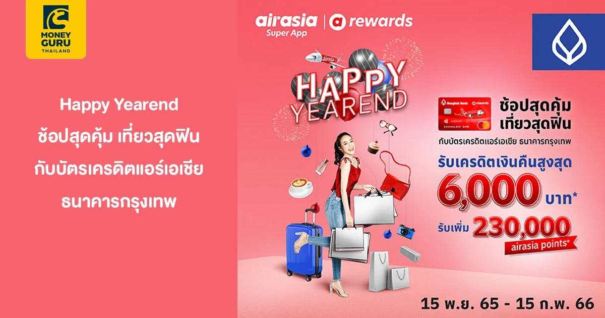- ตัวอย่างการคำนวณ ดังนี้ ตัวอย่างที่ 1 คุณ ก เดือนที่ 1 ระหว่างวันที่ 15 พ.ย. 2565 -16 ธ.ค. 2565 ใช้จ่ายสะสม 8,000 บาท เดือนที่ 2 ระหว่างวันที่ 16 ธ.ค. 2565 – 15 ม.ค. 2566 ใช้จ่ายสะสม 20,000 บาท และ เดือนที่ 3 ระหว่างวันที่ 16 ม.ค. 2566 – 15 ก.พ. 2566 ใช้จ่ายสะสม 30,000 บาท คุณ ก จะได้รับเครดิตเงินคืน จำนวนรวม 700 บาท คำนวณมาจาก เดือน เดือนที่ 1 ได้รับเครดิตเงินคืน 100 บาท เดือน เดือนที่ 2 ได้รับเครดิตเงินคืน 300 บาท และ เดือน เดือนที่ 3 ได้รับเครดิตเงินคืน 300 บาท ตัวอย่างที่ 2 : คุณ ข เดือนที่ 1 ระหว่างวันที่ 15 พ.ย. 2565 -16 ธ.ค. 2565 ใช้จ่ายสะสม 30,000 บาท เดือนที่ 2 ระหว่างวันที่ 16 ธ.ค. 2565 – 15 ม.ค. 2566 ใช้จ่ายสะสม 30,000 บาท และเดือนที่ 3 ระหว่างวันที่ 16 ม.ค. 2566 – 15 ก.พ. 2566 ใช้จ่ายสะสม 50,000 บาท คุณ ข จะได้รับเครดิตเงินคืน จำนวนรวม 6,000 บาท ตัวอย่างที่ 3 : คุณ จ เดือนที่ 1 ระหว่างวันที่ 15 พ.ย. 2565 -16 ธ.ค. 2565 ใช้จ่ายสะสม 30,000 บาท เดือนที่ 2 ระหว่างวันที่ 16 ธ.ค. 2565 – 15 ม.ค. 2566 ใช้จ่ายสะสม 20,900 บาท เดือนที่ 3 ระหว่างวันที่ 16 ม.ค. 2566 – 15 ก.พ. 2566 ใช้จ่ายสะสม 30,000 บาท คุณ จ จะได้รับเครดิตเงินคืน จำนวนรวม 900 บาท โดยคำนวณมาจาก เดือนที่ 1 ได้รับเครดิตเงินคืน 300 บาท เดือนที่ 2 ได้รับเครดิตเงินคืน 300 บาท และ เดือนที่ 3 ได้รับเครดิตเงินคืน 300 บาท - เงื่อนไขสำหรับผู้ที่มียอดใช้จ่ายสูงสุด 5 ท่านแรก ท่านจะได้รับ Bonus airasia points เพิ่ม 230,000 airasia points เมื่อมียอดใช้จ่ายสะสมผ่านบัตร ตั้งแต่ 100,000 บาทขึ้นไปตลอดช่วงโปรโมชั่น (1 สิทธิ์ / บัญชีบัตร ตลอดรายการ) รางวัล Bonus airasia points สนับสนุนโดยบิ๊กไลฟ์ (ประเทศไทย) จำกัด กรณีมีผู้มีสิทธิได้รับรางวัลในแต่ละลำดับมากกว่า 1 ท่าน ธนาคารจะมอบรางวัลให้แก่ผู้ที่ทำรายการเข้ามาก่อนตามเวลาในระบบของธนาคาร และประกาศรายชื่อผู้ทีมียอดใช้จ่ายสูงสุดทาง www.bangkokbank.com ภายในวันที่ 31 มีนาคม 2566 ทั้งนี้ บิ๊กไลฟ์ (ประเทศไทย) จำกัด มอบคะแนน Bonus airasia points ภายใน 90 วัน หลังจากจบโปรโมชั่นเข้าบัญชี airasia member ID ที่ผูกกับบัตรเครดิตของท่าน