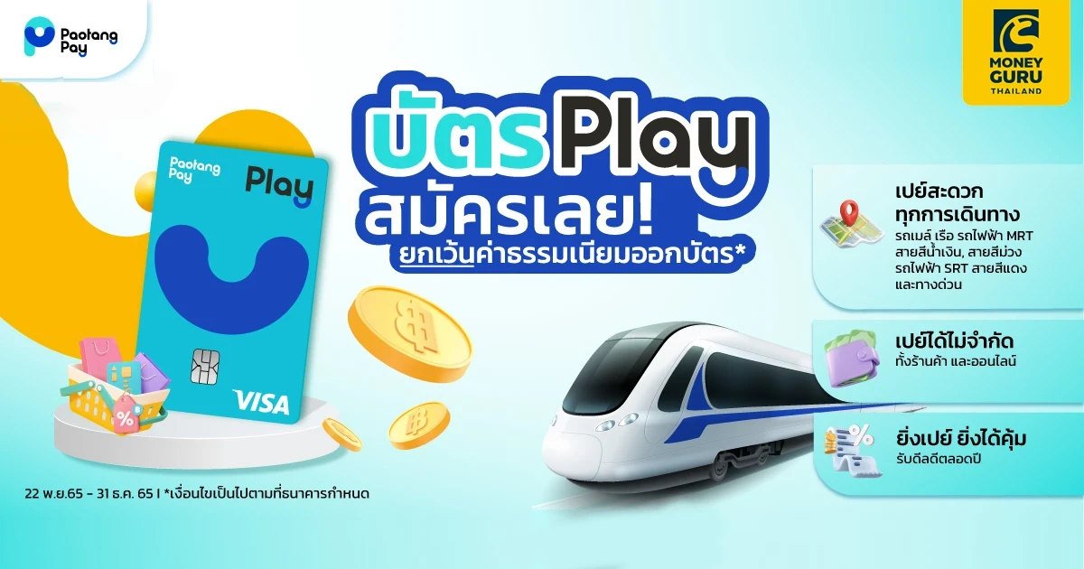 - กิจกรรมส่งเสริมการขายนี้ สำหรับลูกค้าที่ต้องการสมัครบัตร Play บนเป๋าตังเปย์ ในแอปพลิเคชันเป๋าตัง ภายในระยะเวลาส่งเสริมการขายเท่านั้น ลูกค้าจะได้รับการยกเว้นค่าธรรมเนียมการออกบัตรมูลค่า 50 บาท และค่าธรรมเนียมการจัดส่งบัตร มูลค่า 42 บาท มูลค่ารวม 92 บาท