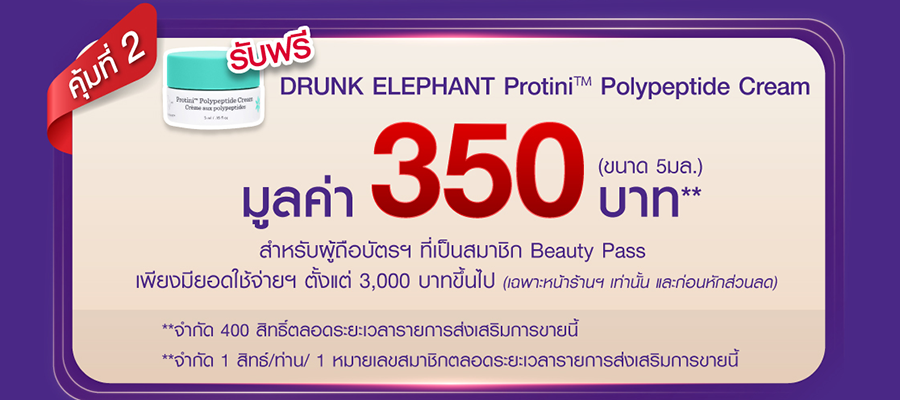 คุ้มที่ 2 รับฟรี DRUNK ELEPHANT Protini™ Polypeptide Cream มูลค่า 350 บาท (ขนาด 5 มล.) สำหรับผู้ถือบัตร ที่เป็นสมาชิก Beauty Pass เพียงมียอดใช้จ่าย ตั้งเเต่ 3,000 บาทขึ้นไป (เฉพาะหน้าร้านเท่านั้น เเละก่อนหักส่วนลด) จำกัด 400 สิทธิ์ตลอดระยะเวลารายการส่งเสริมการขายนี้ จำกัด1 สิทธิ์/ท่าน/ 1 หมายเลขสมาชิกตลอดระยะเวลารายการส่งเสริมการขายนี้