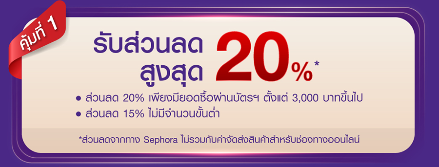 คุ้มที่ 1 รับส่วนลด สูงสุด 20% เพียงมียอดซื้อผ่านบัตร ตั้งเเต่ 3,000 บาทขึ้นไป ส่วนลด 15% ไม่มีจำนวนขั้นต่ำ ส่วนลดจากทาง Sephora ไม่รวมกับค่าจัดส่งสินค้าสำหรับช่องทางออนไลน์
