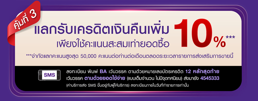 คุ้มที่ 3 เเลกรับเครดิตเงินคืนเพิ่ม 10% เพียงใช้คะเเนนสะสมเท่ายอดซื้อ จำกัดเเลกคะเเนนสูงสุด 50,000 คะเเนนต่อท่านต่อเดือนตลอดระยะเวลารายการส่งเสริมการขายนี้