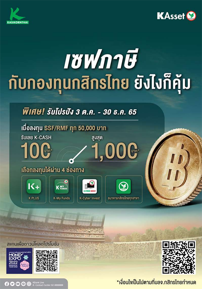 เซฟภาษีกับกองทุนกสิกรไทย ยังไงก็คุ้ม รับโปรปังเมื่อลงทุน SSF/RMF ทุก 50,000 บาท ผ่านช่องทาง K PLUS และ/หรือ K-My Funds และ/หรือ K-Cyber Invest และ/หรือ ธนาคารกสิกรไทยทุกสาขา ทุกๆ 50,000 บาท รับหน่วยลงทุน K-CASH มูลค่า 100 บาท (สูงสุด 1,000 บาท/ท่าน*)