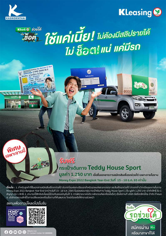 สินเชื่อรถช่วยได้ : KBank ช่วยได้เมื่อช็อต ไม่ต้องมีสลิปรายได้ ไม่ช็อตแน่ แค่มีรถ ...พิเศษ เฉพาะในงาน รับกระเป๋าเดินทาง Teddy House Sport มูลค่า 1,250 บาท เมื่อยื่นเอกสารการสมัครสินเชื่อรถช่วยได้ภายในงาน Money Expo 2022 Bangkok Year-End วันที่ 15 - 18 ธ.ค. 65 เท่านั้น