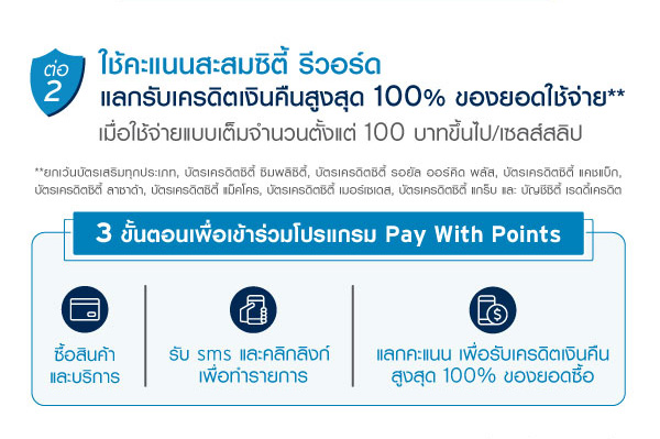 ต่อที่ 2 :ใช้คะเเนนสะสมซิตี้ รีวอร์ด เเลกรับเครดิตเงินคืนสูงสุด 100% ของยอดใช้จ่าย** เมื่อใช้จ่ายเเบบเต็มจำนวนตั้งเเต่ 100 บาทขึ้นไป/เซลล์สลิป