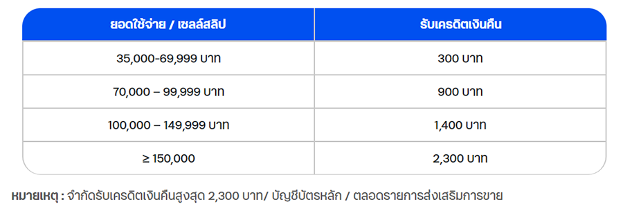 - รับเครดิตเงินคืน 2,300 บาท เมื่อมียอดใช้จ่ายตั้งแต่ 150,000 บาทขึ้นไป/ เซลล์สลิป