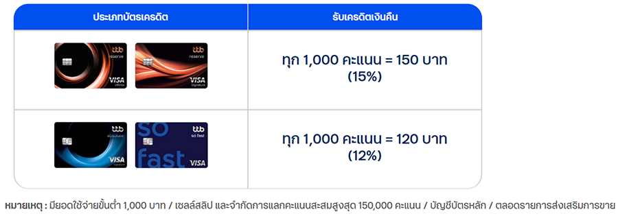 สิทธิพิเศษ 2 : แลกรับเครดิตเงินคืนสูงสุด 15% เมื่อใช้คะแนนสะสมทุก 1,000 คะแนน สำหรับบัตรเครดิตประเภทที่มีคะแนนสะสม