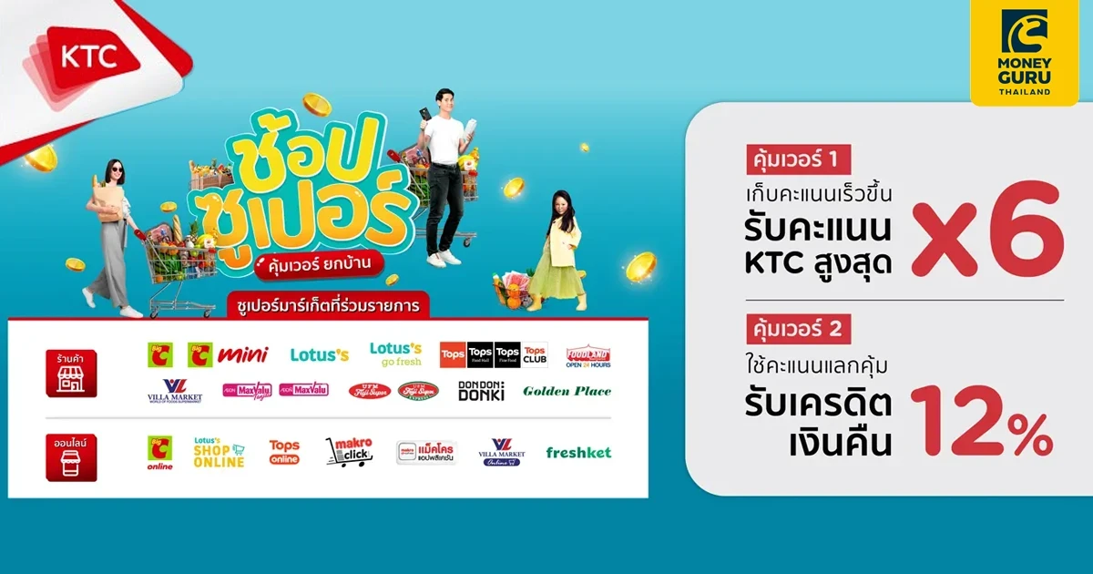 - รายการส่งเสริมการขาย ("รายการ") นี้ บริษัท บัตรกรุงไทย จำกัด (มหาชน) หรือ เคทีซี จัดทำขึ้นเพื่อมอบสิทธิประโยชน์เครดิตเงินคืนให้แก่สมาชิกบัตรเครดิต KTC ("สมาชิก") ที่มีคะแนน KTC FOREVER ("คะแนน") และมียอดใช้จ่ายผ่านบัตรเครดิต KTC ("บัตรฯ") ณ ทุกร้านค้าในหมวด Supermarket ภายใต้ MCC Code: 5333 และ 5411 ในช่วงระหว่างวันที่ 1 ก.พ. 66 – 30 เม.ย. 66 (“ระยะเวลารายการ”) ตามเงื่อนไขที่กำหนดเท่านั้น