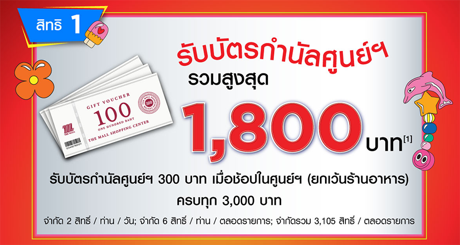 สิทธิพิเศษสำหรับ บัตรเครดิต SCB M VISA รับบัตรกำนัลศูนย์ฯ สูงสุด 1,800 บาท* เมื่อช้อปที่ศูนย์การค้า เดอะมอลล์ เเละ เอ็ม ไลฟ์สโตร์ สาขาที่ร่วมรายการ ตามเงื่อนไขที่กำหนด