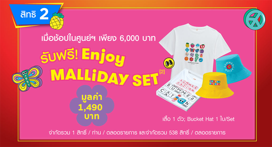สิทธิที่ 2 : รับฟรี ! Enjoy Malliday set (เสื้อยืด+Bucket Hat) มูลค่า 1,490 บาท เมื่อช้อปสะสมผ่านบัตรเครดิต SCB M VISA ครบ 6,000 บาทขึ้นไปภายในวัน และสาขาเดียวกัน (ยกเว้นใบเสร็จร้านอาหาร)