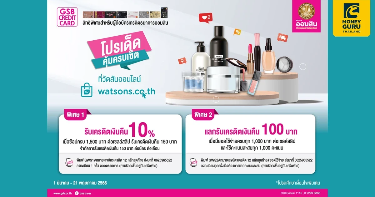 - สิทธิพิเศษสำหรับผู้ถือบัตรเครดิตธนาคารออมสินทุกประเภทที่ใช้จ่ายบัตรฯ ผ่าน Watsons Online เท่านั้น