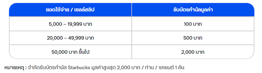 - บัตรกำนัล Starbucks ใบละ 1,000 บาท จำกัด 50 ใบ หรือรวมมูลค่า 50,000 บาทตลอดรายการ