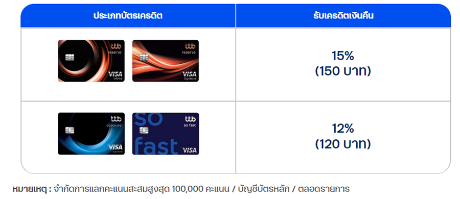 2. ใช้คะแนนสะสม ttb rewards ทุกๆ 1,000 คะแนน และต้องไม่เกินยอดใช้จ่าย แลกรับเครดิตเงินคืน สำหรับบัตรเครดิต ttb reserve infinite และ บัตรเครดิต ttb reserve signature รับเครดิตเงินคืน 150 บาท และสำหรับบัตรเครดิต ttb บัตรเครดิตทีเอ็มบี และบัตรเครดิตธนชาต ประเภทที่มีคะแนนสะสม รับเครดิตเงินคืน 120 บาท โดยจำกัดการแลกคะแนนสะสมสูงสุด 100,000 คะแนน / บัญชีบัตรหลัก / ตลอดรายการส่งเสริมการขาย ทั้งนี้การแลกคะแนนสะสมต้องไม่เกินยอดใช้จ่ายต่อเซลล์สลิป โดยมียอดใช้จ่ายขั้นต่ำ 1,000 บาทขึ้นไป / เซลล์สลิป ระบบจะคำนวณเฉพาะบัตรหลักที่มีการลงทะเบียนเท่านั้น