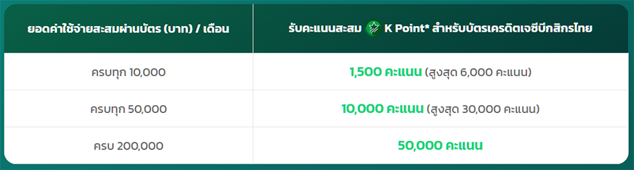 วิธีการคำนวณคะแนน K Point พิเศษ : - บัตรเครดิตเจซีบีกสิกรไทยที่มียอดใช้จ่ายสะสมในแต่ละเดือน ทุก 10,000 บาทขึ้นไป จะได้รับคะแนนสะสม K Point พิเศษ 1,500 คะแนน (สูงสุด 6,000 คะแนน) / ยอดใช้จ่ายสะสมทุก 50,000 บาทขึ้นไป จะได้รับคะแนนสะสม K Point พิเศษ 10,000 คะแนน (สูงสุด 30,000 คะแนน) / ยอดใช้จ่ายสะสมครบ 200,000 บาทขึ้นไป จะได้รับคะแนนสะสม K Point พิเศษ 50,000 คะแนน