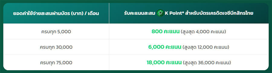 วิธีการคำนวณคะแนนสะสม K Point พิเศษ : - บัตรเครดิตเจซีบีกสิกรไทยที่มียอดใช้จ่ายสะสมในแต่ละเดือน ทุก 5,000 บาทขึ้นไป จะได้รับคะแนนสะสม K Point พิเศษ 800 คะแนน (สูงสุด 4,000 คะแนน) / ยอดใช้จ่ายสะสมทุก 30,000 บาทขึ้นไป จะได้รับคะแนนสะสม K Point พิเศษ 6,000 คะแนน (สูงสุด 12,000 คะแนน) / ยอดใช้จ่ายสะสมทุก 75,000 บาทขึ้นไป จะได้รับคะแนนสะสม K Point พิเศษ 18,000 คะแนน (สูงสุด 36,000 คะแนน)