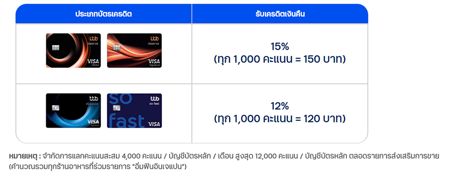 3. การแลกคะแนนสะสมรับเครดิตเงินคืนต้องมียอดใช้จ่ายขั้นต่ำ 1,000 บาทขึ้นไป / เซลล์สลิป ที่ ร้านอาหารที่ร่วมรายการเท่านั้น โดยคะแนนสะสมทุก 1,000 คะแนน แลกรับเครดิตเงินคืน 150 บาท สำหรับบัตรเครดิต ttb reserve infinite และบัตรเครดิต ttb reserve signature และ แลกรับเครดิตเงินคืน 120 บาท สำหรับบัตรเครดิต ttb (บัตรเครดิตทีเอ็มบีและบัตรเครดิตธนชาต) ประเภทที่มีคะแนนสะสม โดยจำกัดการแลกคะแนนสะสมเพื่อรับเครดิตเงินคืนสูงสุด 4,000 คะแนน / บัญชีบัตรหลัก / เดือน สูงสุด 12,000 คะแนน / บัญชีบัตรหลัก ตลอดรายการส่งเสริมการขาย ทั้งนี้การแลกคะแนนสะสมแต่ละครั้งต้องไม่เกินยอดใช้จ่ายต่อเซลล์สลิป โดยระบบจะคำนวณเฉพาะบัตรหลักที่มีการลงทะเบียนเท่านั้น