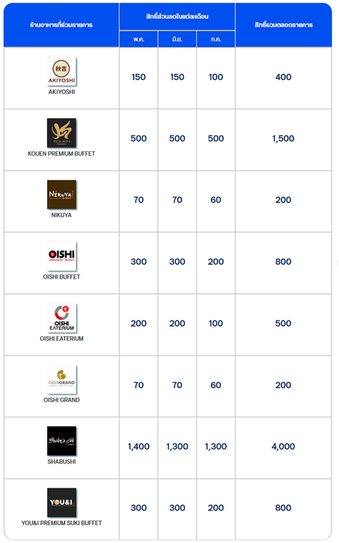 1. ร้าน AKIYOSHI, KOUEN PREMIUM BUFFET, NIKUYA, OISHI BUFFET, OISHI EATERIUM, OISHI GRAND และ SHABUSHI รับเครดิตเงินคืน ได้ทุกวัน คลิกเพื่อดูเงื่อนไขเพิ่มเติม